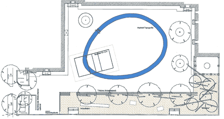 ein Oval. Die Ränge werden aus einer ca. 45,0 m langen, sich